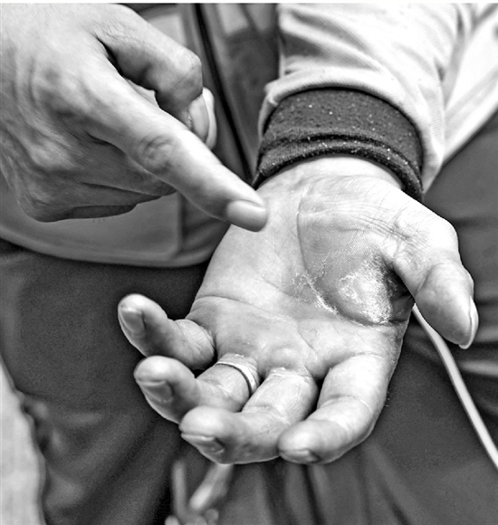 送餐地方有电梯还好,没电梯就得爬楼。为了爬楼更快,王建生做了一根“铁拐”,一拐一发力,上下楼梯很迅速。也因为这样,王建生左手虎口的大块老茧已经泛黄。
