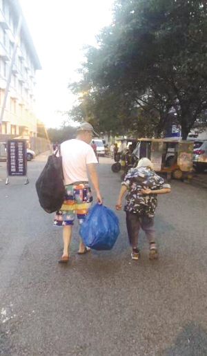 原标题 男子帮拾荒婆婆扛口袋 老人三鞠躬致谢