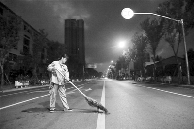 8月6日,上海,沈美兰在五角场环岛商业圈清洁路面。