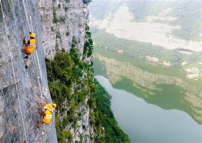 8月9日,抢险人员在侯月铁路柏枝隧道上方悬崖进行碎石作业(无人机拍摄)。