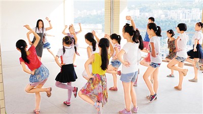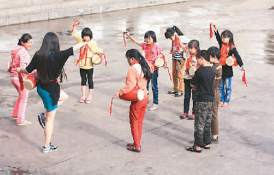 志愿者为孩子们组织了很多课外活动。图为谭轩(左二)正在组织学生练习腰鼓。