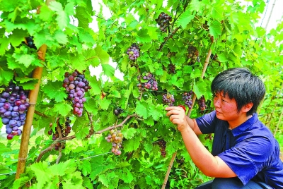 经过3年多的努力,秦山农场已扩展到60多亩土地,同时带动了周边农户调整农业种植结构,示范推广绿色无公害蔬菜面积达200多亩,提高了农民收入。图为8月20日,李泽岩在农场内修剪葡萄枝叶。新华社记者 杨世尧摄