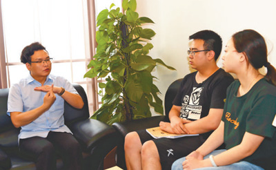 唐帅(左)为社区聋哑人朋友解答法律问题。本报记者 李坚 摄