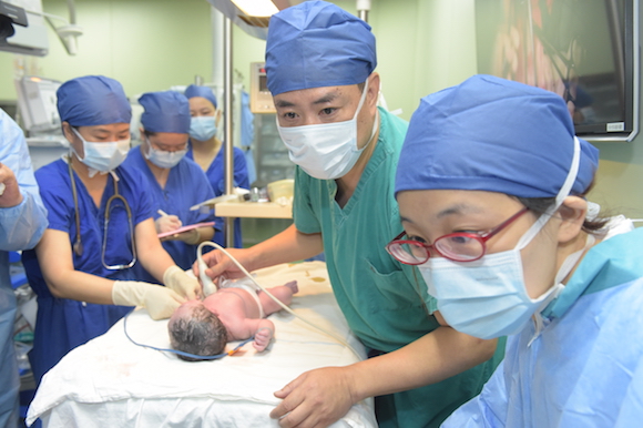 上午8点,新华医院的一间手术室吸引了众人的目光,看起来普通的一台孕38周+3天的剖宫产手术却关乎着一项医疗新技术的成果。在麻醉科主任石学银、张成密医生产妇实施麻醉后,妇产科主任汪希鹏、妇产科王磊副主任医生井然有条地站到手术台两侧,开始了手术,仅用了20分钟,汪希鹏主任就通知一旁的新生儿医生,说:“宝宝出来了!”众人的目光就集中在医生的手中,一个大胖小子带着响亮的哭声来到了这个世间。这标志着宝宝建立了自己的心肺循环系统。