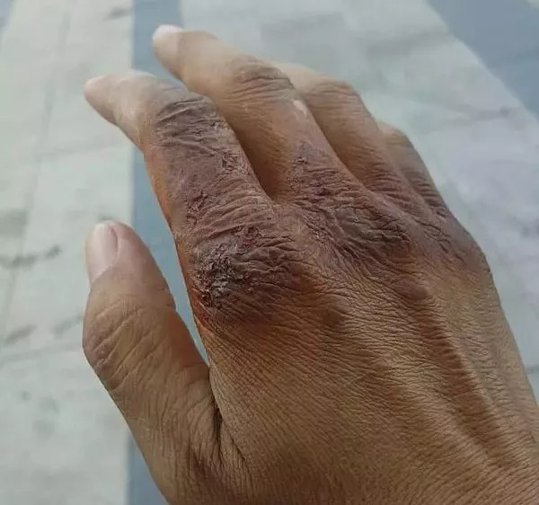 靳利勇告诉记者,把火扑灭后,他才发现手和脚已经被烫伤。回到家后,烫伤部位起了大大小小的水泡。晚上,火辣辣的痛感让他几乎没睡。