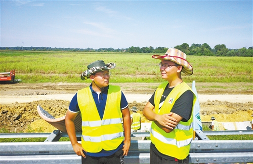 山东高速集团员工郑毅(左)在塞尔维亚E763高速公路项目工地上和同事一起工作。廉 丹摄