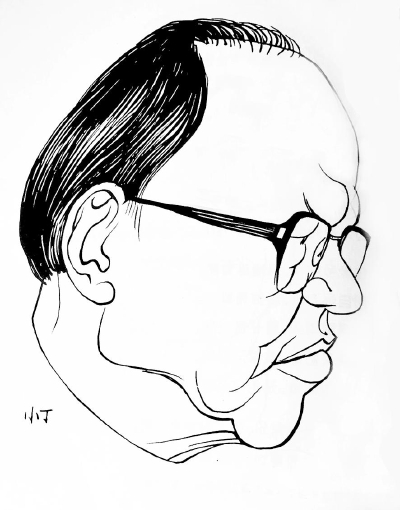 朋友戴敦邦评说他:“多才多艺,平易近人,青春不老,幽默补膏。”到底有多“补”?照他老朋友侯宝林的说法:笑一笑,十年少。不知有多少七八十岁的人被他逗得大笑七次——回到了童年。但他不笑。所以,他寿数常在——一直活了整整一个世纪。不信,你看丁聪画他的肖像:眉关紧锁,一脸的忧愁幽思。或许,正因为满腹忧愁,所以希望用笑来驱赶,在笑声中同那些忧愁说声 “拜拜”!屈大夫“忧愁幽思,乃赋离骚”。方成先生是:忧愁幽思,乃作漫画。