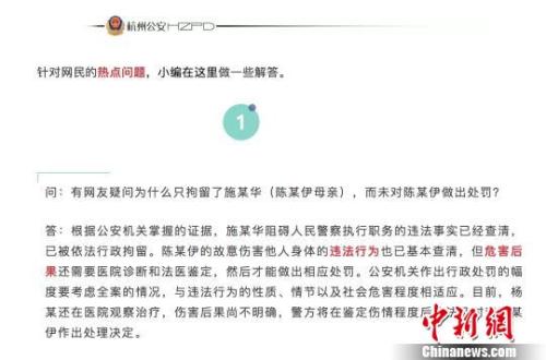 9月11日凌晨,警方再次发布最新处理情况介绍,经公安机关调查取证,施某华因涉嫌阻碍执行职务已被依法行政拘留。陈某伊故意伤害他人身体的违法行为已基本查清,因目前杨某正在医院治疗,伤情程度尚需医院进一步诊断确定,根据《公安机关办理行政案件程序规定》有关规定,公安机关将对杨某伤情进行鉴定后依法对案件作出处理,相关进展将及时向社会公布。