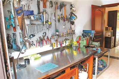 而控制整个火车微缩世界的关键,则在庭院中一个小二层的建筑中。张久安的儿子张驰告诉记者,“这栋小楼的木架构基本都是我父亲和我一同手工完成的。这些对于我们玩模型的人来说,都是小case。何况基础建设时,我们捉襟见肘,每一分钱都得花在刀刃上。”小楼一层是木工房,一面墙上挂满了手工工具,工作台上还摆放着未完成的手工制品。二层就是总调度室,虽然只有一台小小的电脑,但是可以对全院的火车模型进行调度。张驰说,“我们模拟的是现实中的火车调度,分毫不差,不像旁人想得那么简单。”走出调度室,来到观景平台,便可以俯瞰庭院,近四分之三的轨道状况皆可纳入眼帘。