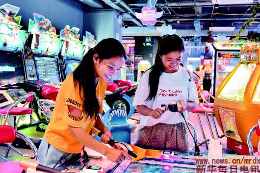 2018年8月21日,成都春熙路,阿来阿呷(右)和尔古依呷第一次体验电玩。
