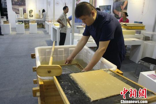 山西襄汾县邓庄丁陶麻笺社青年手工艺人王刚则在现场展示造纸技艺中的抄纸工序,他小心翼翼地将抄纸帘置入水中放平,平行向前或向后移动,直至在工具上方形成一层纸膜。王刚告诉记者,山西平阳麻笺历史悠久,具有柔韧性强、吸墨性好、保存时间长等特点,古代多为皇宫用纸,当下深受书画名家和传统文化爱好者的青睐。目前平阳麻笺制作技艺主要以师傅带徒弟的形式代代相传。