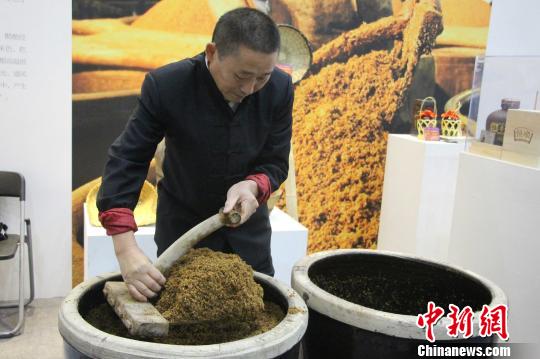 镇江恒顺香醋酿造技艺国家级代表性传承人乔贵清在现场向参观者展示酿醋过程中的翻醅工序。 赵晓 摄