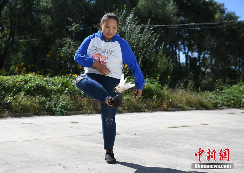 左亚慈会在天气晴朗的时候,在室外踢踢毽子,运动一下。张瑶 摄
