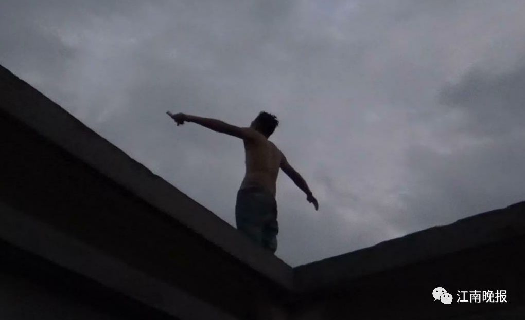 从横梁跳下后,消防员先摔在天台地面,而跳楼的男子则整个人压在他的身上。两人均受了些伤,而此时消防员仍喊着,让急救人员先救跳楼的男子。