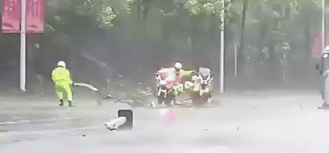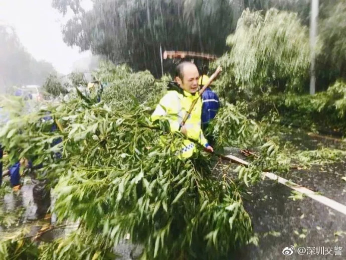 东莞东城交警大队执勤人员顶着狂风暴雨,清理路面障碍,消除交通安全隐患。