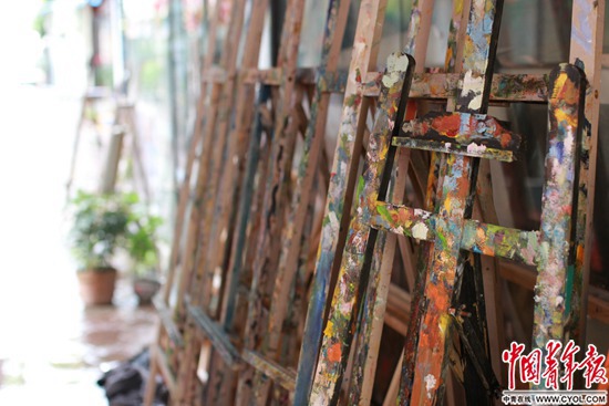 周永久来大芬村30年了,刚来时,他压根儿不知道梵高是谁。画廊里的作画台跟了他10年,上面的颜料积了大概20厘米,各种颜色混在一起,最后呈现苔藓般的深绿色,有土地般的质感。旁边的墙被他拿来顺手擦画笔,颜料在上面淤积,摸起来像钟乳石。他觉得画工必须勤奋。那时他一个月最多出货五六千张画,带着徒弟做。有徒弟画着画着,就坐在椅子上睡着,笔从指缝滑下来。