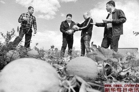 在黑龙江省青冈县的裸仁南瓜种植示范区,杨勇(左二)向柞岗镇红升村村民张权(右二)了解裸仁南瓜种植情况(9月13日摄)。新华社记者王建威摄