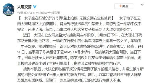 据悉,9月20日下午,在大理市环海东路天镜阁附近路段,一辆正在行驶中的小轿车引擎盖上坐着一名女子,车辆由一男子驾驶。交警大队对情况进行了调查核实。经查,9月20日,当事男子陈某租赁了云A5A9XX号小轿车,载姚某到大理自驾游。当日下午,当车行驶至大理市环海东路,陈某提议让姚某乘坐到车辆引擎盖上拍照。姚某按陈某建议坐到了车辆引擎盖上,由陈某驾驶车辆继续向前行进。