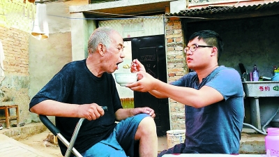 正说着,同事将午餐送来,放到书桌上。尽管父亲自己能吃饭,赵德龙还是坐在对面的床上给父亲喂饭,因为动作不方便,他又立刻坐到父亲身边,用汤匙将饭菜舀起来送到老人嘴里,“来,吃一块鸡蛋。”吃了几口以后,他会用纸巾将父亲的嘴擦干净。