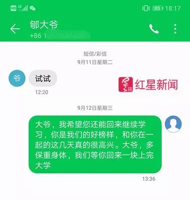 “大爷,我希望您还能回来继续学习,你是我们的好榜样,和你在一起的这几天真的很高兴。大爷,多保重身体,我们等你回来一块上完大学。”郇政华的舍友给他发短信说。