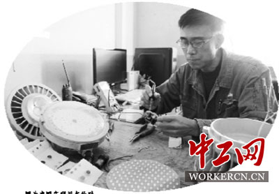 图为李国庆利用午休时间在修理LED灯。车玉花 摄