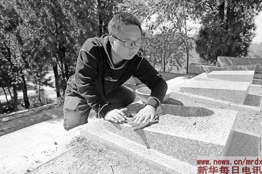 闫永杰在长城脚下的八达岭烈士陵园擦拭烈士墓碑(9月28日摄)。新华社记者王君璐摄