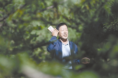 9月22日上午,即将上台演出的秦建国在舞台后面的林子里进行最后一次排练。