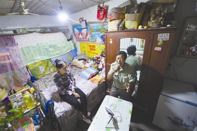 9月16日晚,秦建国利用手机平台在租住的家中练歌,老伴是他唯一的听众。