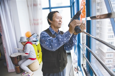 9月18日,徐有贵(图右)来到一户人家修窗户,他的二人转搭档也陪着他一起,等着干完后排练。