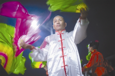 9月16日晚,下班的张洪雷脱下保安制服,加入到秧歌队中,他是队中唯一的男队员。