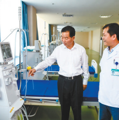 李世贵(左)在南京江宁横溪街道一处社区卫生服务中心查看血透室建设情况。新华社记者 李响摄