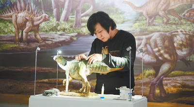 赵闯在整理自己制作的恐龙模型。杨 琪摄(人民视觉)