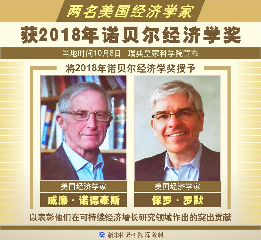 新华社斯德哥尔摩10月8日电 瑞典皇家科学院8日宣布,将2018年诺贝尔经济学奖授予美国经济学家威廉·诺德豪斯和保罗·罗默,以表彰他们在可持续经济增长研究领域作出的突出贡献。
