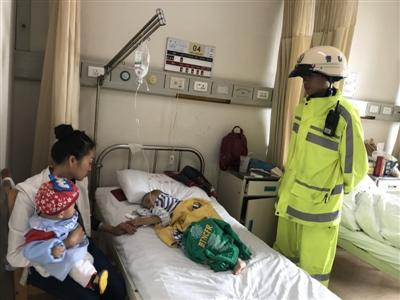 昨日上午10点过,3岁的小丰丰在乘坐大巴时意外被夹断手指,血流不止,母亲立即带着他和另一名9个月大的孩子乘坐出租车前往医院。在成都金沙江路路口,出租车司机见到正在执勤的成都市交警三分局五大队协警王旭东,向其求助。接到求助后,王旭东立即骑上警用摩托车,拉响警笛向医院疾驰而去。由于病情严重,王旭东带着母子三人先后辗转两家医院,还把身上的400余元拿给年轻妈妈垫付医药费,救治孩子。