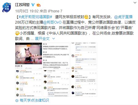 据@江苏网警 10月9日晚消息,有网友反映,虎牙直播200万订阅的主播@莉哥OvO在直播过程中,竟公然篡改国歌曲谱,以嬉皮笑脸的方式表现国歌内容,并将国歌作为自己所谓“网络音乐会”的“开幕曲”。目前,该主播直播间已经被虎牙封禁。