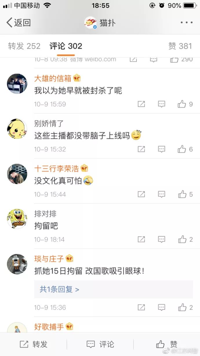 在今天(10日)零时许的再次致歉中,她称翻看网友评论时羞愧难当,自己在直播时哼唱国歌的行为“愚蠢低级”,为自己在直播间不严肃唱国歌的行为诚挚道歉,“我的行为深深的伤害了大家的感情:对不起。对不起祖国、对不起粉丝、对不起网友、对不起平台。”
