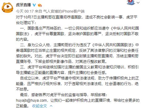 今天(10日)零时许,虎牙直播平台在官方微博上公布了对此事的处理结果:虎牙平台决定即日起封禁主播莉哥直播间,冻结主播莉哥直播账号,下架全部相关影像作品,对其进行整改教育。