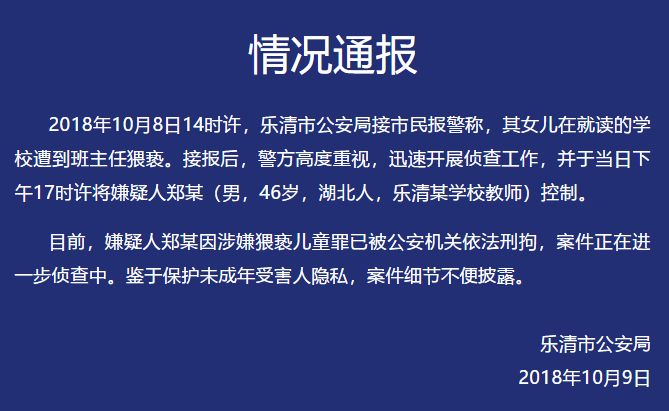 10月9日19:45, “乐清公安”微信公众号发布情况通报:嫌疑人郑某因涉嫌猥亵儿童罪已被公安机关依法刑拘,案件正在进一步侦查中。