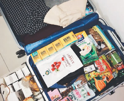 图为网友晒出的“妈妈给装的行李箱”。(源自网络)