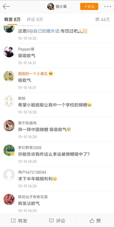 而自“信小呆”中奖后,她的每一条微博的转发量都以万计数,转发内容也几乎都是“转发锦鲤”,人们试图分享她的超级好运。