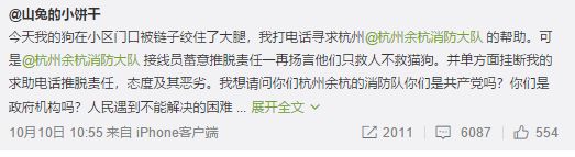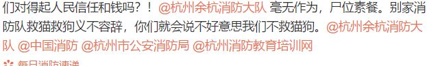 该网友还在推文的最后@杭州余杭消防大队 指责其毫无作为,“别家消防队救猫救狗义不容辞,你们就会说不好意思我们不救猫狗。”