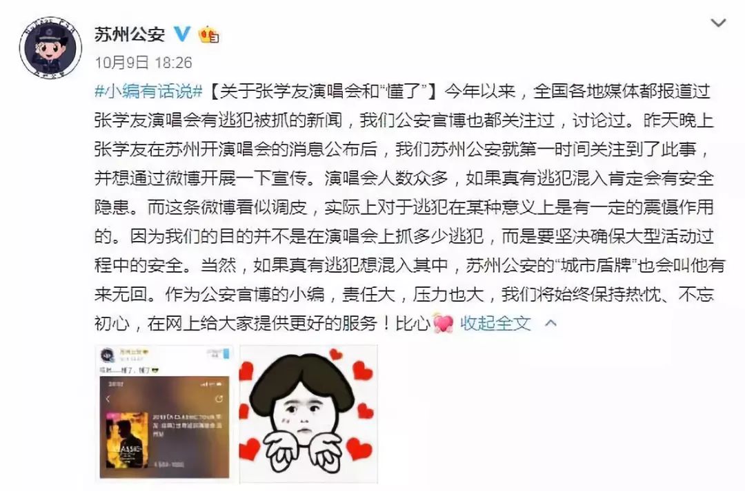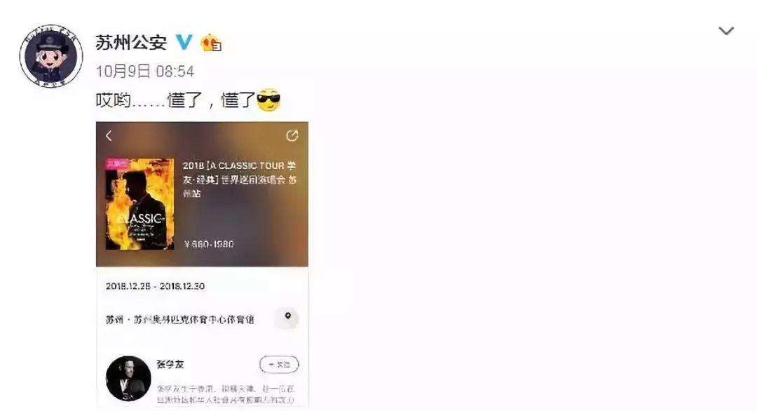 这不,听闻张学友苏州演唱会将于12月举行,苏州公安就立马做出了反应。10月9日,苏州公安官微在社交平台晒出张学友将在苏州举办演唱会的图片并配文“哎呦,懂了,懂了。”