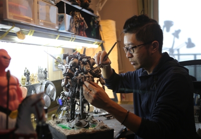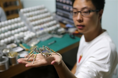 目前,他已原创了24种产品,销量最高的是机械蜘蛛,“因为身子是机械表做的,不仅摆设好看,还能看时间,很实用”;售价最高的是一种机甲,手掌大小却用了200多种零件拼接。任军的产品主要在线上销售,“上一批产品已销往国外”,任军说,从去年开始全职投入,尚在起步阶段,年收入约为15万元。