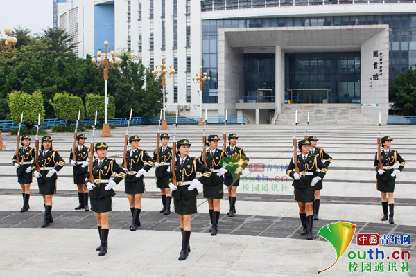 中国青年网北京10月18日电 广东医科大学有一支学生国旗护卫队,其中,由12名女生组成的队列吸人眼球。她们没有学习素材,便研究军乐节上的表演,揣摩思索后再创造,形成独立风格和整套动作。训练难免会牺牲队员们的休息时间,她们在节假日也需要加紧训练。