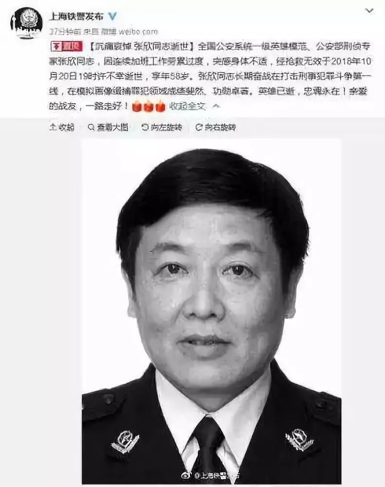 据上海铁路公安局官方微博消息,全国公安系统一级英雄模范、公安部刑侦专家、上海铁路公安局刑事侦查处一级警长张欣同志,因连续加班工作劳累过度,突感身体不适,经抢救无效于2018年10月20日19时许不幸逝世,享年58岁。