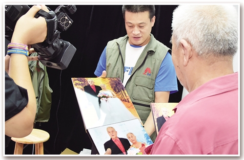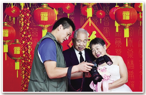 上图 史超齐为老年夫妻拍摄结婚照。本报记者 常理 摄