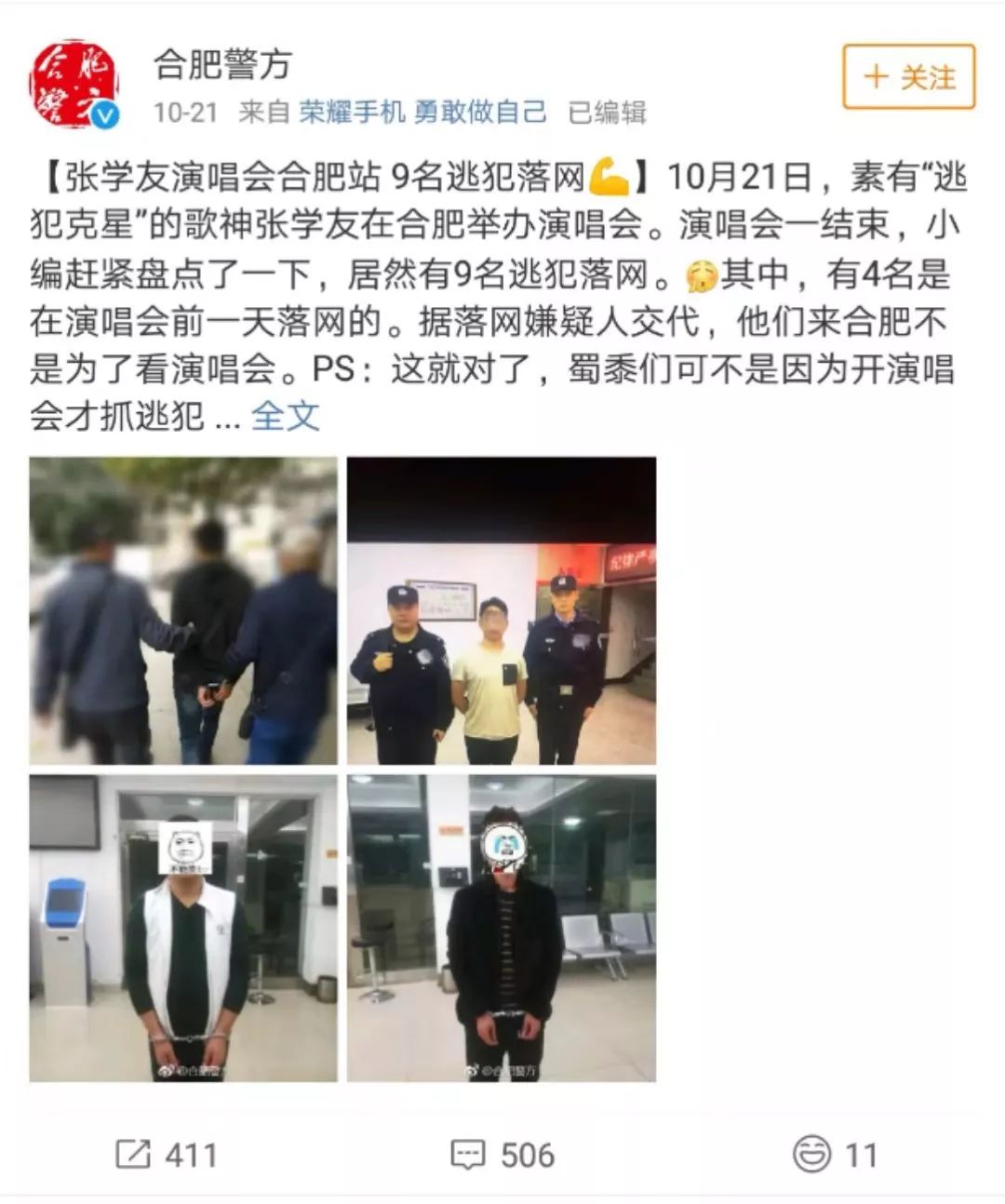 10月21日,素有“逃犯克星”的歌神张学友在安徽合肥举办演唱会。演唱会一结束,合肥警方对外发布:有9名逃犯落网。其中,有4名是在演唱会前一天即已落网。