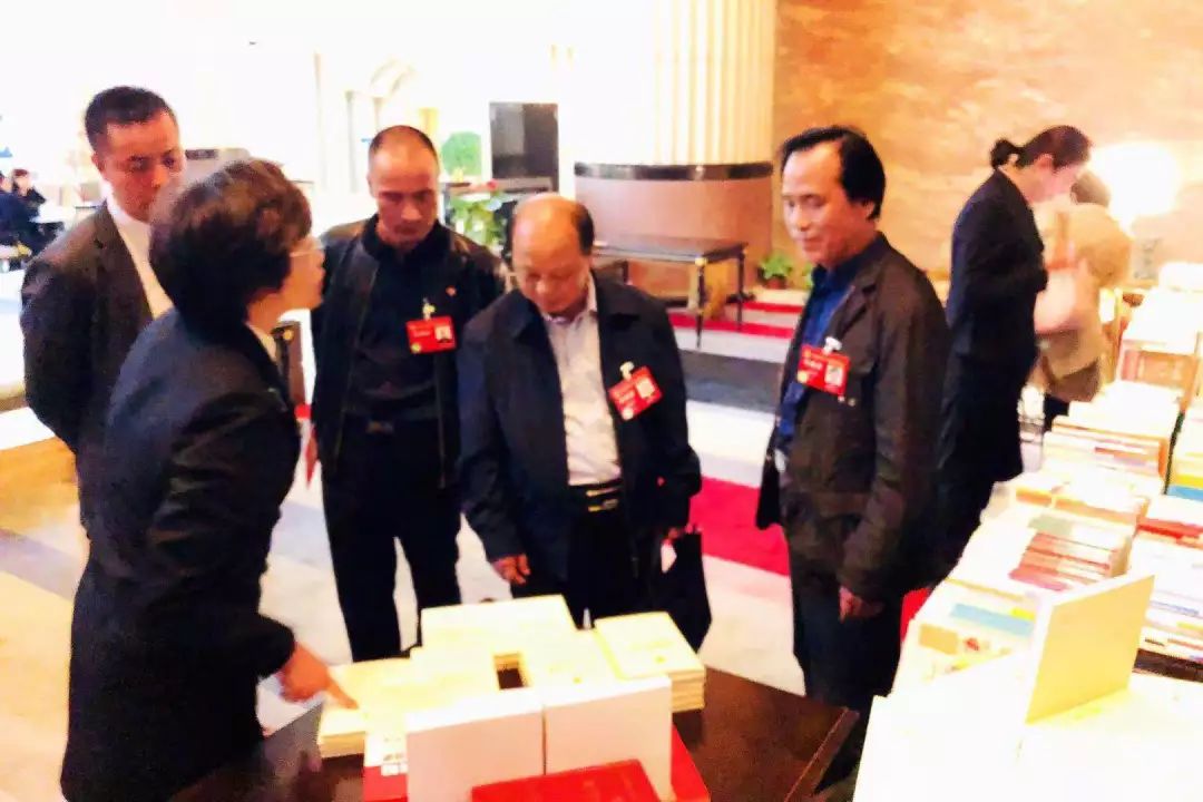 10月21日晚,巨晓林(右二)、高凤林(右一)、肉孜麦麦提·巴克(右三)到中国工会十七大文化服务展位上参观。