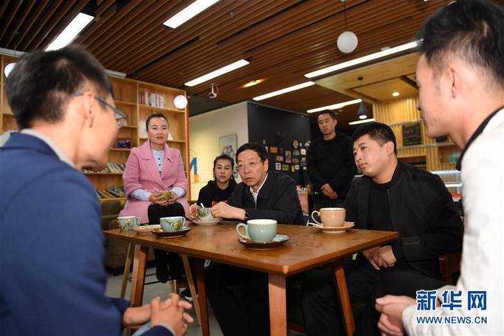 延安市市长薛占海(中)在延安新区898创新空间与青年创业者交流(10月16日摄)。 新华社记者 李一博 摄