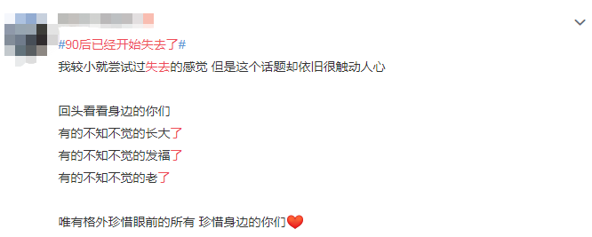 “我较小就尝试过失去的感觉 但是这个话题却依旧很触动人心。回头看看身边的你们,有的不知不觉的长大了,有的不知不觉的发福了,有的不知不觉的老了。唯有格外珍惜眼前的所有,珍惜身边的你们。